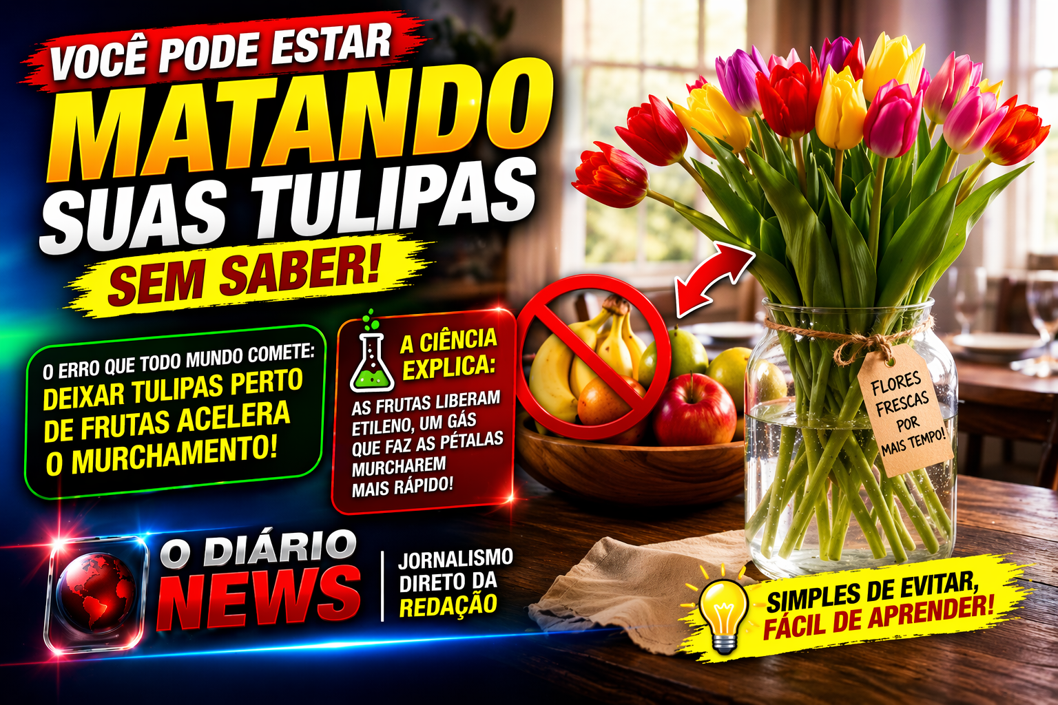 A explicação está na ciência. Diversas frutas liberam um gás natural chamado etileno, um hormônio vegetal responsável por acelerar o processo de amadurecimento. Esse mesmo composto, no entanto, também atua diretamente no envelhecimento de outras plantas e flores, como as tulipas.